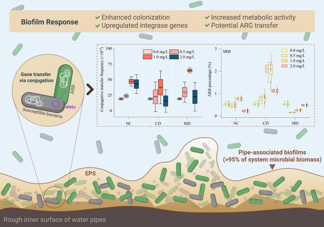 摘要:The persistent use of antibiotics has exacerbated the spread of antibiotic-resistant bacteria (ARB) and antibioticresistant genes (ARGs) in aquatic environments, including drinking water systems. Pipeline biofilms, comprising over 95 % of microbial biomass, function as high-risk reservoirs for ARG accumulation and horizontal gene transfer (HGT). However, the roles of disinfection-induced biofilm aggregation in plasmid-mediated conjugation remains mechanistically obscure. This study investigated how sodium hypochlorite (NaClO), chlorine dioxide (ClO2), and their combination affect ARB selection and ARG conjugation in multispecies drinking water biofilms at environmentally relevant chlorine concentrations (0–2.0 mg/L). Results showed that exposure to either NaClO or ClO2 at 1.0 mg/L increased the relative abundance of ARB, while combined disinfection at 2.0 mg/L exerted selective pressure that further enhanced ARB enrichment. Sublethal chlorine levels increased conjugation frequencies within biofilms by 2.1- to 5.9-fold relative to untreated controls. Conjugation efficiency was positively correlated with bacterial surface colonization and metabolic activity (r = 0.95, p < 0.05). Mechanistic investigations revealed that chlorine exposure upregulated integrase genes, enriched potential ARG-hosting taxa, and preserved fimbrial structures, collectively facilitating donor-recipient interactions and promoting HGT. These findings elucidate the mechanistic pathways underlying disinfection-mediated horizontal gene transfer and provide critical insights into managing antibiotic resistance risks in drinking water systems.