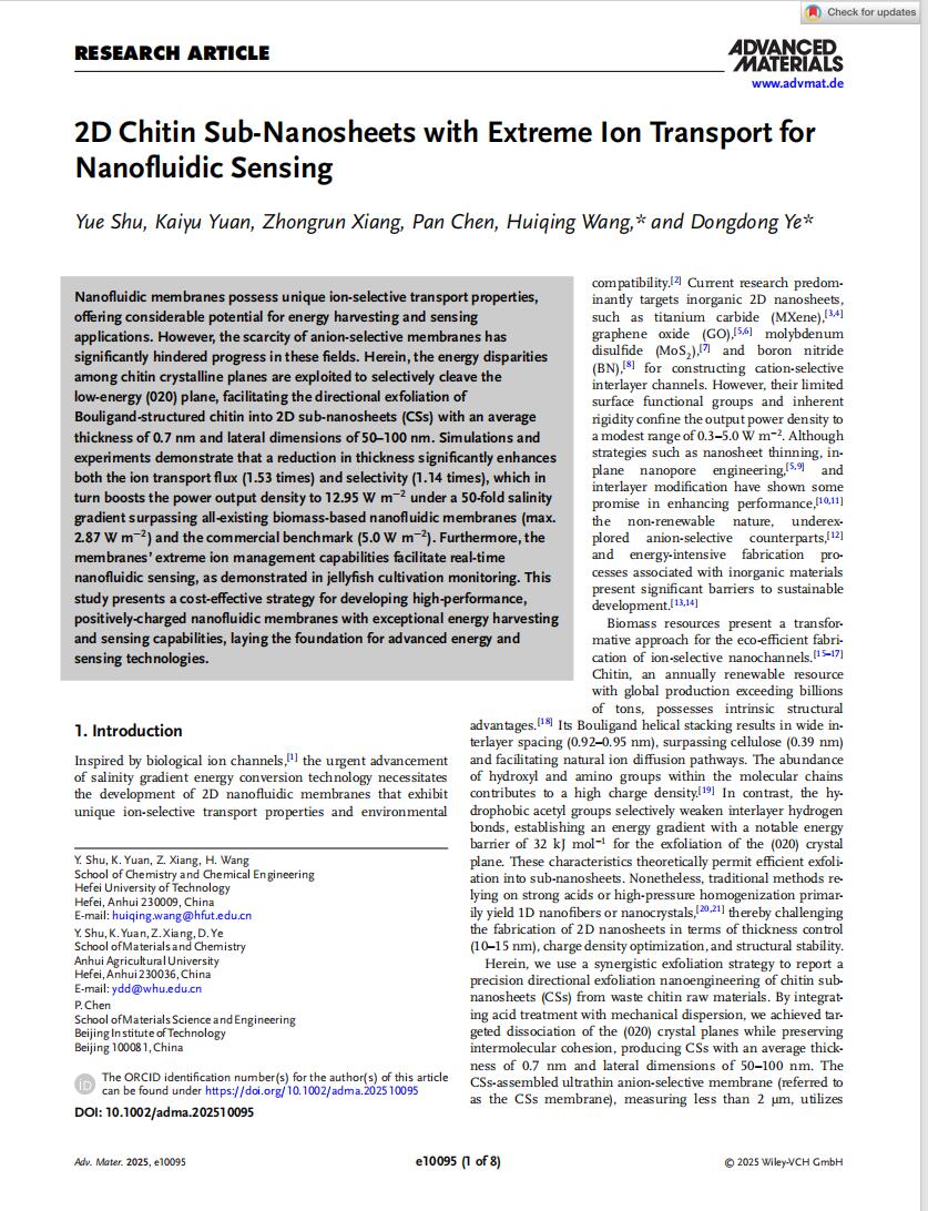 本课题组硕士研究生舒悦、袁开宇、向忠润三人联合研究在国际著名期刊《先进材料》(Advanced Materials, IF~28)发表了一项突破性研究成果。通过对甲壳素(020)晶面定向进攻并结合机械分散得到甲壳素亚纳米片(厚度约 0.7 nm,粒径50-100 nm),并将其应用在蓝色能源收集上,在50倍的盐差下得到超高的输出功率密度12.95 W/m², 超越所有现有基于生物质的纳米流体膜(最高2.87 W/m²)和商业基准(5.0 W/m²)。此外,膜优异的离子管理能力促进了在实时纳米流体传感上的应用,如对水母养殖环境的监测。该研究提出了一种开发高性能、带正电荷纳米流体膜的经济有效策略,这些膜具有出色的能量收集和传感能力,为先进能源和传感技术奠定了基础。感谢安徽农业大学叶冬冬教授联合指导。本研究得到了国家自然科学基金项目以及安徽省优秀青年基金项目等项目的共同资助。
