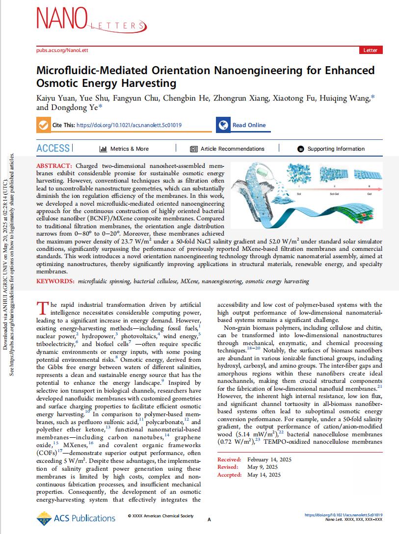 纳米纤维素Mxene序构化纺膜构筑盐差发电器件发表在Nano Letter