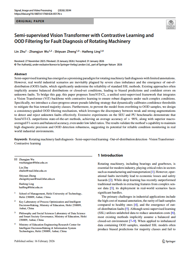 Semi-supervised Vision Transformer with Contrastive Learning and OOD Filtering for Fault Diagnosis of Rotating Machinery