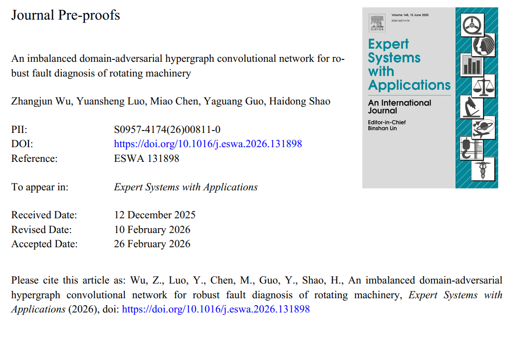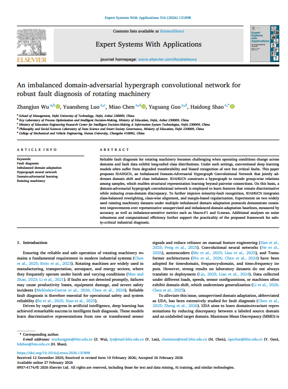 摘要:Reliable fault diagnosis for rotating machinery becomes challenging when operating conditions change across domains and fault data exhibit long-tailed class distributions. Under such settings, conventional deep learning models often suffer from degraded transferability and biased recognition of rare but critical faults. This paper proposes IDAHGCN, an Imbalanced DomainAdversarial Hypergraph Convolutional Network that jointly addresses domain shift and class imbalance. IDAHGCN constructs a hypergraph to encode group-wise relations among samples, which enables structural representation learning beyond pairwise connections. On this basis, a domain-adversarial hypergraph convolutional network is employed to learn features that remain discriminative while reducing cross-domain discrepancy. To further improve minority-fault recognition, IDAHGCN integrates class-balanced reweighting, class-wise alignment, and marginbased regularization. Experiments on two widely used rotating machinery datasets under multiple imbalanced domain adaptation protocols demonstrate consistent improvements over representative unsupervised and imbalanced domain adaptation baselines, measured by accuracy as well as imbalance-sensitive metrics such as Macro-F1 and G-mean. Additional analyses on noise robustness and computational efficiency further support the practicality of the proposed framework for safetycritical industrial diagnosis.