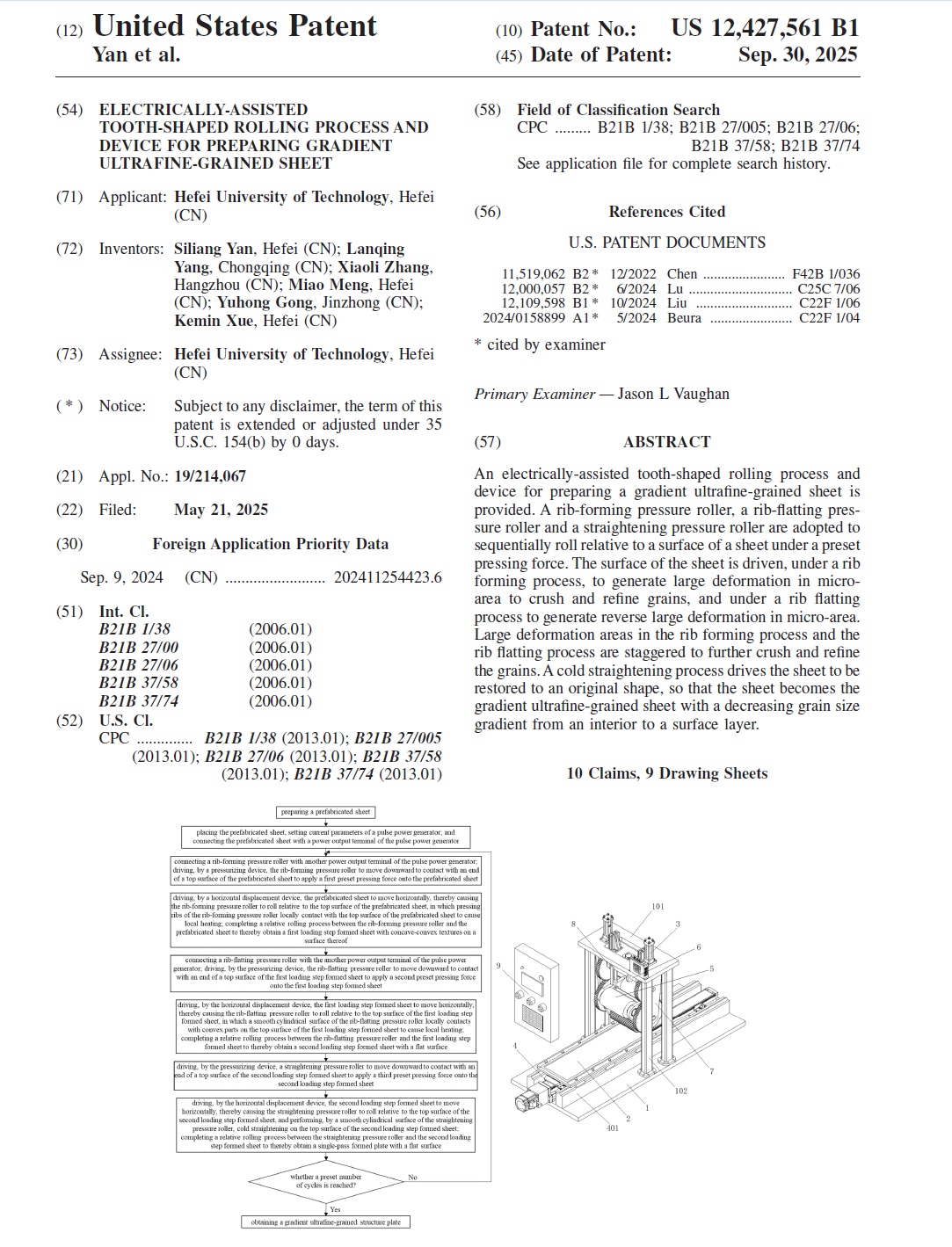 PPH-巴黎公约进入美国-US-2025-0020_19214067_制备梯度超细晶组织板材的电辅助齿形辊压工艺及装置_专利证书(1).pdf